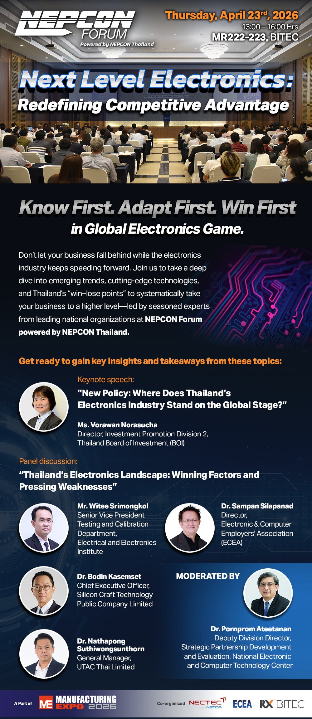 NEPCON Thailand is an event where providers of technology and solutions for electronics manufacturing will meet over 10,000 electronics industrialists from across ASEAN to grow a broader trade network, and is a part of Manufacturing Expo which will feature 7 mega shows of manufacturing and supporting industries.